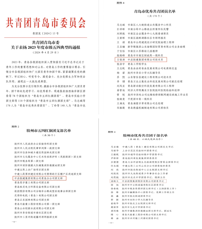 2024年是紀(jì)念五四運(yùn)動(dòng)105周年,也是新中國(guó)成立75周年。為傳承和弘揚(yáng)“五四”精神,全面展現(xiàn)上合新區(qū)青年奮發(fā)進(jìn)取的精神風(fēng)貌,膠州團(tuán)市委在膠州市市民文化中心二樓舉行“奮進(jìn)青春力量,建功五大新城”膠州市紀(jì)念五四運(yùn)動(dòng)105周年主題團(tuán)日暨青春故事宣講會(huì)活動(dòng),膠州市委副書(shū)記劉濤出席并發(fā)表致辭,團(tuán)市委書(shū)記孫傳奇帶領(lǐng)全體團(tuán)員、團(tuán)干部重溫入團(tuán)誓詞,會(huì)上對(duì)全市“五四典型”進(jìn)行通報(bào)表?yè)P(yáng)。中啟膠建集團(tuán)有限公司青島分公司團(tuán)支部榮獲2023年度“膠州市五四紅旗團(tuán)支部”稱(chēng)號(hào),中啟膠建集團(tuán)膠州分公司團(tuán)員青年職工王銘濤榮獲“青島市優(yōu)秀共青團(tuán)員”稱(chēng)號(hào),中啟控股集團(tuán)股份有限公司團(tuán)委書(shū)記袁曉文榮獲“膠州市優(yōu)秀共青團(tuán)干部”稱(chēng)號(hào)。