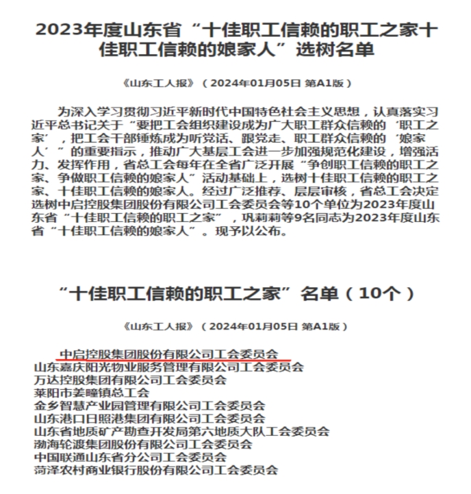 近日,山東省總工會(huì)在全省范圍內(nèi)開(kāi)展“爭(zhēng)創(chuàng)職工信賴的職工之家、爭(zhēng)做職工信賴的娘家人”選樹(shù)活動(dòng)。經(jīng)過(guò)廣泛推薦、網(wǎng)絡(luò)投票、現(xiàn)場(chǎng)考察等層層審核,全省共選樹(shù)10個(gè)單位為2023年度山東省“十佳職工信賴的職工之家”,中啟控股集團(tuán)股份有限公司工會(huì)委員會(huì)成功獲評(píng)此項(xiàng)榮譽(yù)。