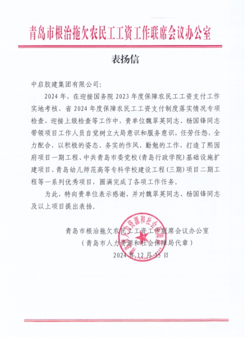 2024年,在公司領(lǐng)導(dǎo)的正確帶領(lǐng)下,在各單位各項(xiàng)目的大力支持和相關(guān)工作人員辛勤付出下,公司在保障農(nóng)民工工資支付工作方面先后圓滿完成了各項(xiàng)調(diào)研、檢查工作并取得了優(yōu)異成績。為表彰我公司在保障農(nóng)民工工資支付工作方面做出的突出貢獻(xiàn),青島市人社局、膠州市人社局分別向公司發(fā)來感謝信,對(duì)公司及在調(diào)研、檢查工作中做出突出貢獻(xiàn)的先進(jìn)項(xiàng)目和先進(jìn)個(gè)人魏翠英、楊國鋒進(jìn)行通報(bào)表揚(yáng)。